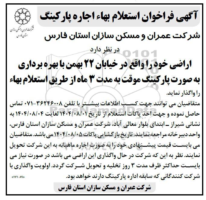 شرکت عمران و مسکن سازان استان فارس در نظر دارد اراضی خود را واقع در خیابان 22 بهمن با بهره برداری به صورت پارکینگ موقت به مدت 3 ماه از طریق استعلام بها را واگذار نماید. متقاضیان می توانند جهت کسب اطلاعات بیشتر با تلفن 36246008-071 تماس حاصل نموده و جهت اخذ پاکات استعلام از تاریخ 1404.8.1 الی 1404.8.4 به نشانی شیراز ابتدای بلوار معالی اباد شرکت عمران و مسکن سازان استان فارس واحد دبیرخانه مراجعه نمایند. تاریخ بازگشایی پاکات 1404.8.5 می باشد. متقاضیان می بایست قیمت پینشهادی خود را به صورت اجاره ماهیانه به این شرکت تحویل نمایند. نظر به اینکه شرکت در حال واگذاری این اراضی می باشد در صورت نیاز می بایست حداکثر ظرف مدت 3 روز تخلیه و تحویل شرکت گردد. اولویت واگذاری با شرکت کنندگانی که سابقه اداره پارکینگ دارند خواهد بود