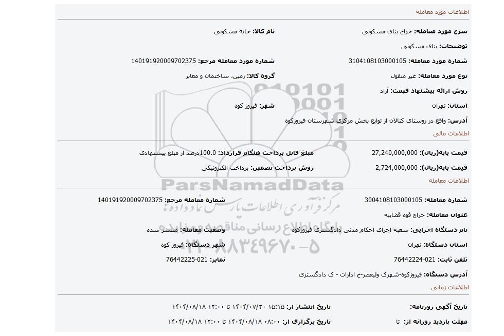 | شماره مورد معامله: 3104108103000105 | شماره مورد معامله مرجع: 140191920009702375 | |