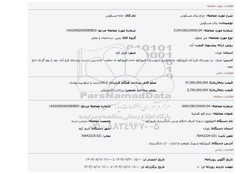 | شماره مورد معامله: 3104108103000104 | شماره مورد معامله مرجع: 14023092000585853 | |