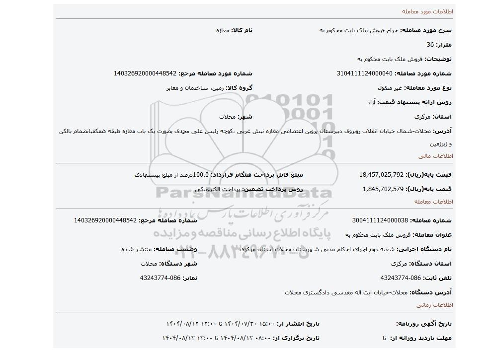 | نام دستگاه اجرایی: شعبه دوم اجرای احکام مدنی شهرستان محلات استان مرکزی | وضعیت معامله: منتشر شده | |