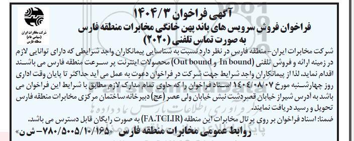 فراخوان فروش سرویس های باند پهن خانگی مخابرات منطقه فارس به صورت تماس تلفنی (2020)