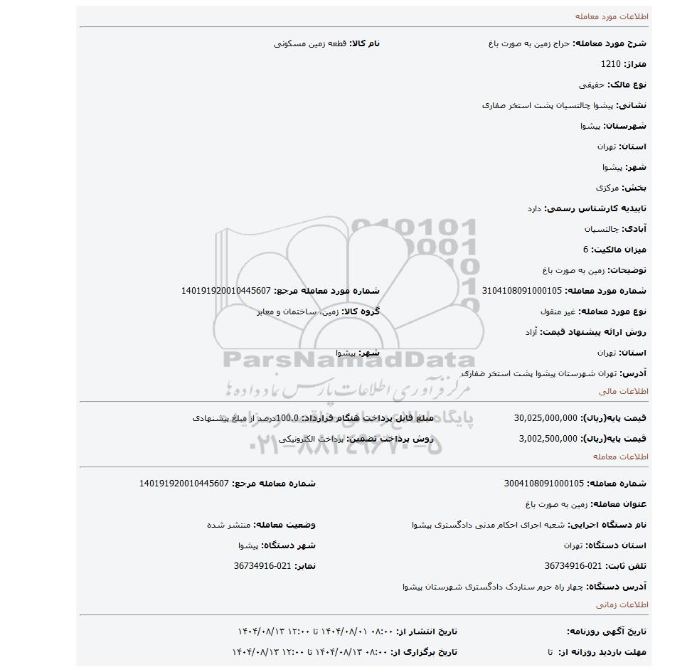 | شماره مورد معامله: 3104108091000105 | شماره مورد معامله مرجع: 140191920010445607 | |