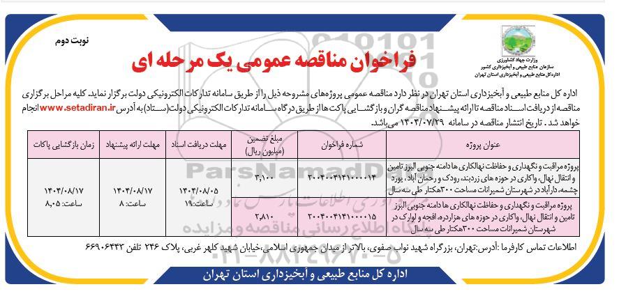 اداره کل منابع طبیعی و آبخیزداری استان تهران در نظر دارد مناقصه عمومی پروژه های مشروحه ذیل را از طریق سامانه تدارکات الکترونیکی دولت برگزار نماید. کلیه مراحل برگزاری مناقصه از دریافت اسناد مناقصه تا ارائه پیشنهاد مناقصه گران و بازگشایی پاکت ها از طریق درگاه سامانه تدارکات الکترونیکی دولت (ستاد) به آدرس سایت ستاد ایران انجام خواهد شد . تاریخ انتشار مناقصه در سامانه 1404.07.29 می باشد.