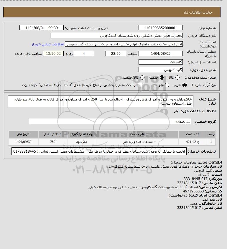شرح کلی نیاز: خاکبرداری و پی کنی و اجرای کامل زیرسازی و اجرای بتن با عیار 250 و اجرای جداول و اجرای کانال