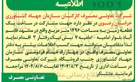 شرکت تعاونی مصرف کارکنان سازمان جهاد کشاورزی خراسان رضوی در نظر دارد جهت مشارکت در ساخت یک قطعه زمین به مساحت 1496 متر مربع واقع در مشهد قاسم آباد بلوار امامیه - امامیه 7 نبش نیک رفتار 3 اقدام نماید لذا متقاضیان میتوانند جهت کسب اطلاعات بیشتر به دفتر تعاونی مصرف واقع در چهار راه خیام فردوسی سازمان جهاد کشاورزی جنب فروشگاه شرکت تعاونی مصرف در ساعت اداری از تاریخ 1404.8.3 لغایت 1404.8.6 مراجعه فرمایند.