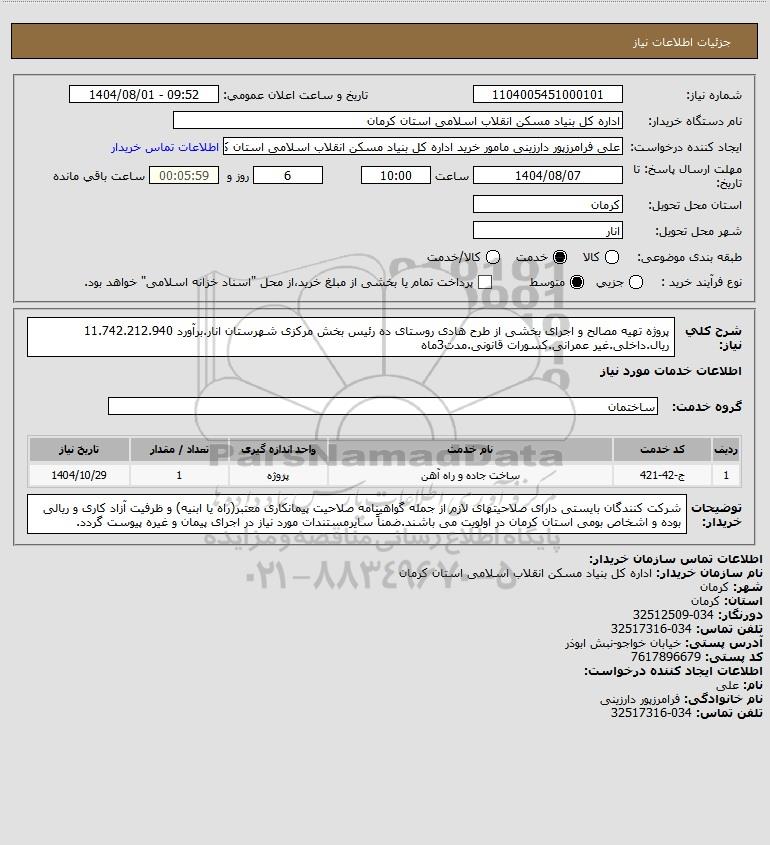 نام دستگاه خریدار:اداره کل بنیاد مسکن انقلاب اسلامی استان کرمان