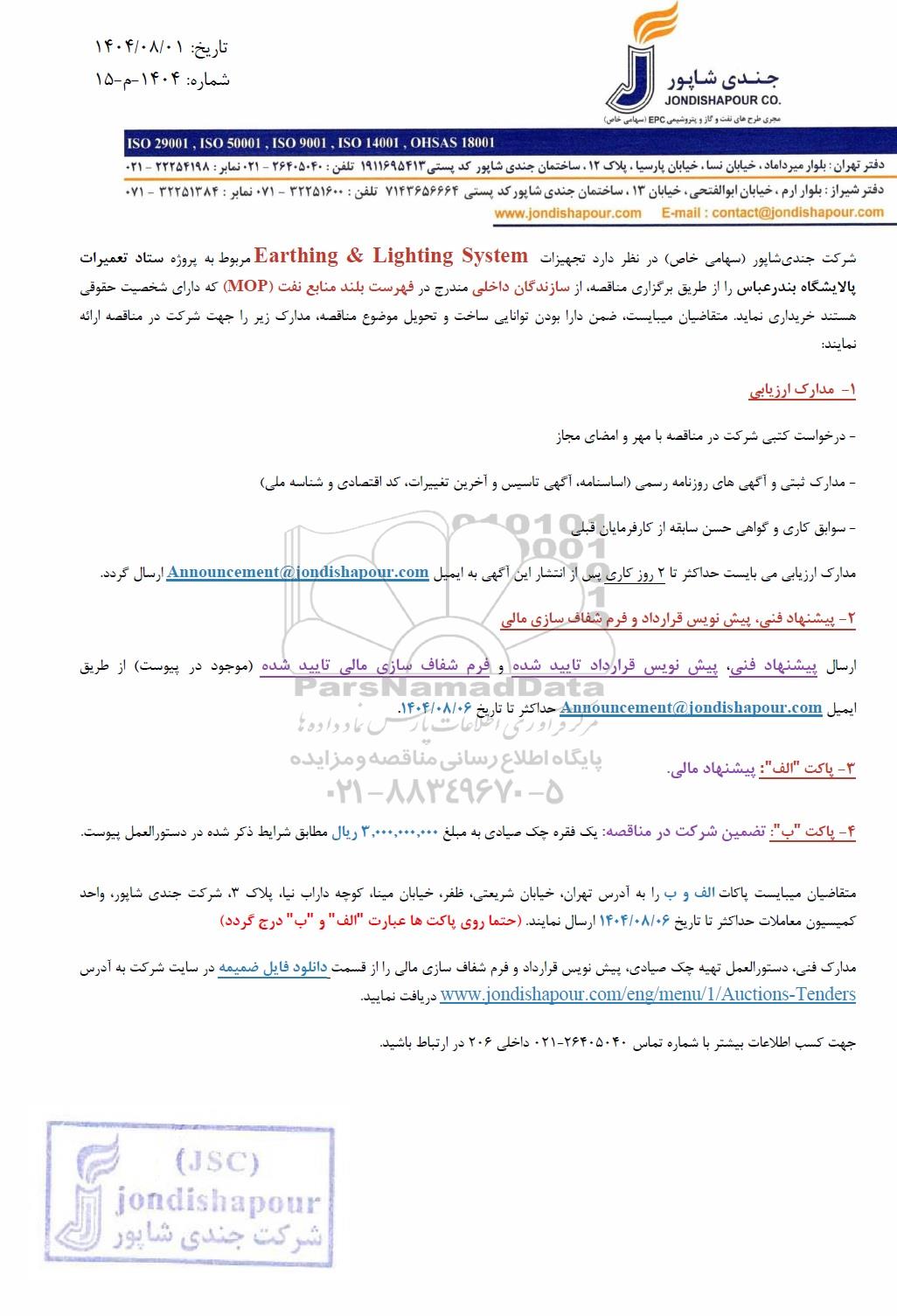 شرکت جندی شاپور (سهامی خاص) در نظر دارد تجهیزات Earthing & Lighting System مربوط به پروژه ستاد تعمیرات پالایشگاه بندرعباس را از طریق برگزاری مناقصه، از سازندگان داخلی مندرج در فهرست بلند منابع نفت (MOP) که دارای شخصیت حقوقی هستند خریداری نماید. متقاضیان می بایست، ضمن دارا بودن توانایی ساخت و تحویل موضوع مناقصه، مدارک زیر را جهت شرکت در مناقصه ارائه نمایند: