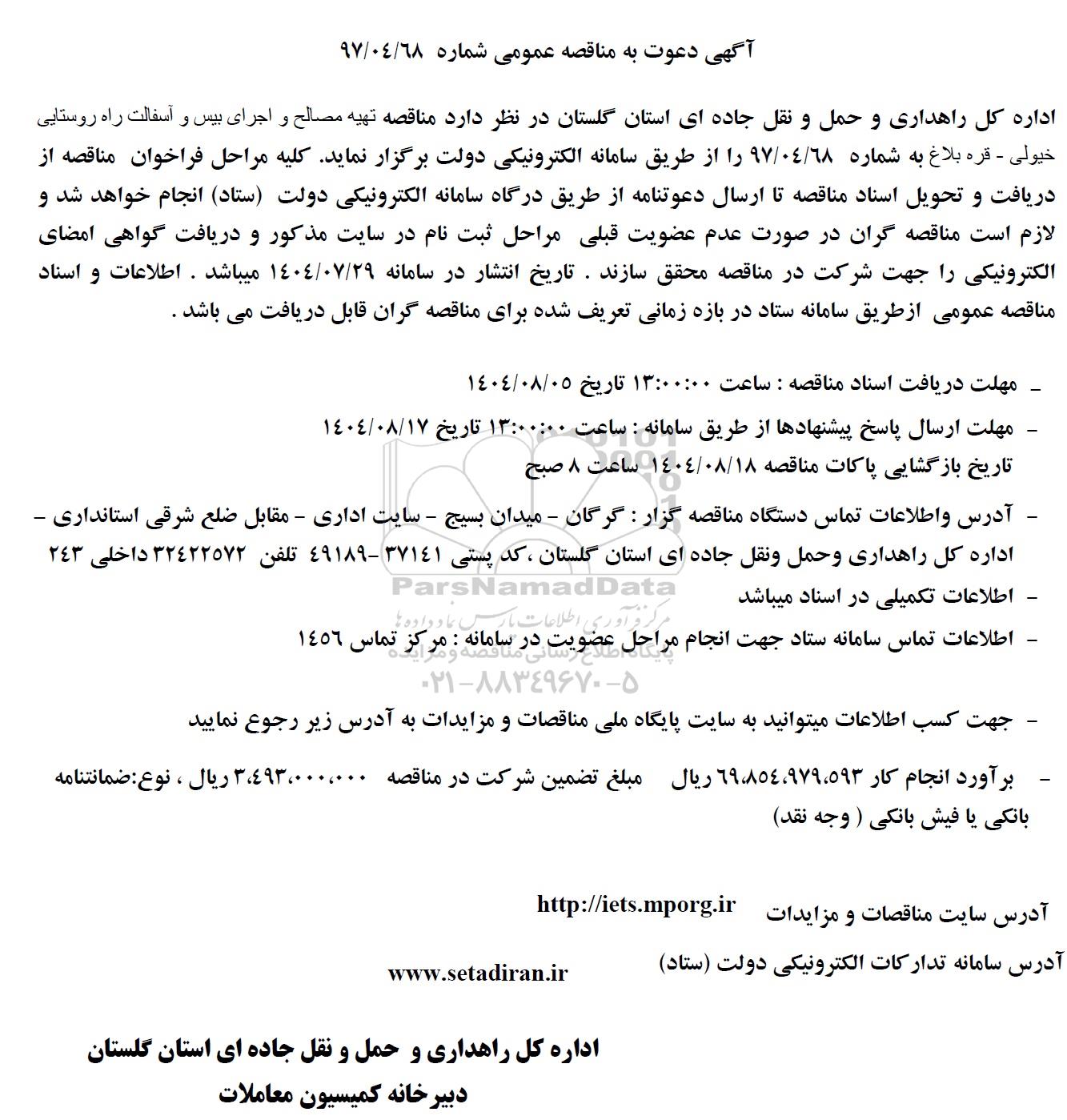 اداره کل راهداری و حمل و نقل جاده ای استان گلستان در نظر دارد مناقصه تهیه مصالح و اجرای بیس و آسفالت راه روستایی خیولی - قره بلاغ به شماره 97/04/68 را از طریق سامانه الکترونیکی دولت برگزار نماید. کلیه مراحل فراخوان مناقصه از دریافت و تحویل اسناد مناقصه تا ارسال دعوتنامه از طریق درگاه سامانه الکترونیکی دولت (ستاد) انجام خواهد شد و لازم است مناقصه گران در صورت عدم عضویت قبلی مراحل ثبت نام در سایت مذکور و دریافت گواهی امضای الکترونیکی را جهت شرکت در مناقصه محقق سازند. تاریخ انتشار در سامانه 1404.7.29 میباشد . اطلاعات و اسناد مناقصه عمومی از طریق سامانه ستاد در بازه زمانی تعریف شده برای مناقصه گران قابل دریافت می باشد.