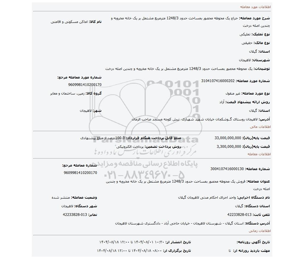 مزایده عمومی مزایده یک محوطه محصور بمساحت حدود 1248/3 مترمربع مشتمل بر یک خانه مخروبه و چندین اصله درخت برگزار میگردد. از کلیه افراد متخصص و شرکت‌های واجد شرایط دعوت به عمل می‌آید تا در این مزایده با کد خبرگزاری پارس نماد : 9742209 شرکت نمایند تاریخ شروع مزایده : 1404/08/01 مهلت شرکت در مزایده: تا پایان روز 1404/08/18 مکان برگزاری اموال واگذاری استان‌های گیلان و دسته‌بندی‌های مربوط به این حراجی املاک و زمین میباشد.