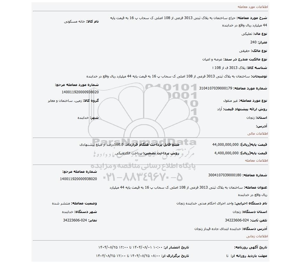 | شرح مورد معامله: حراج ساختمان به پلاک ثبتی 3013 فرعی از 108 اصلی ک سحاب پ 16 به قیمت پایه 44 میلیارد ریال واقع در خدابنده | نام کالا: خانه مسکونی | |