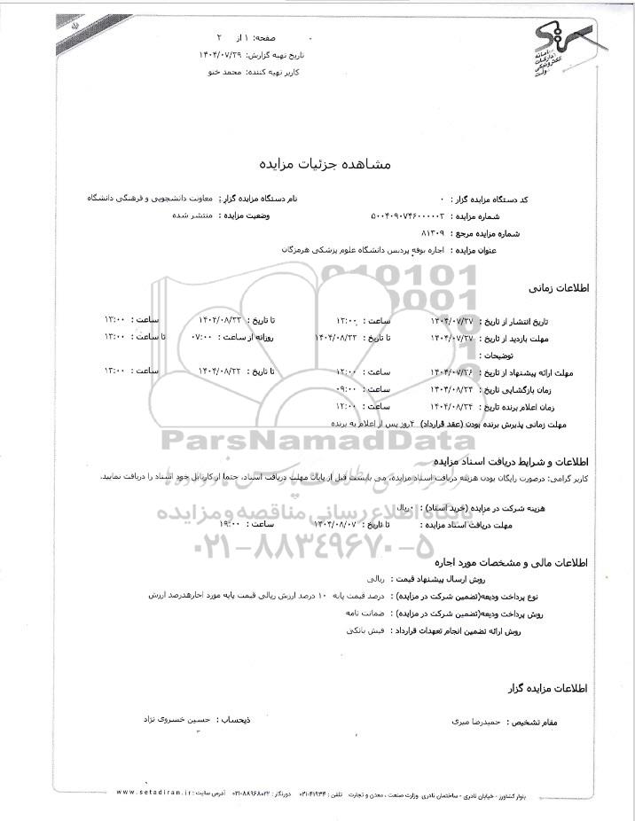 عنوان مزایده : اجاره بوفه پردیس دانشگاه علوم پزشکی هرمزگان