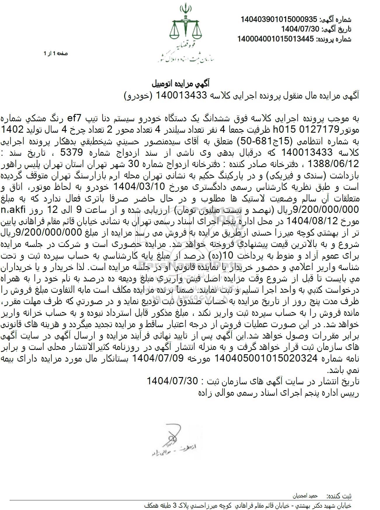 آگهی مزایده مال منقول پرونده اجرایی کلاسه 140013433 (خودرو) به موجب پرونده اجرایی کلاسه فوق ششدانگ یک دستگاه خودرو سیستم دنا تیپ ef7 رنگ مشکی شماره موتور 0150127179 ظرفیت جمعا 4 نفر تعداد سیلندر 4 تعداد محور 2 تعداد چرخ 4 سال تولید 1402 به شماره انتظامی (15 ج 681-50) متعلق به آقای سید منصور حسینی شیخطبقی بدهکار پرونده اجرایی کلاسه 140013433 که در قبال بدهی وی ناشی از سند ازدواج شماره 5379 ، تاریخ سند : 1388.06.12 ، دفتر خانه صادر کننده : دفترخانه ازدواج شماره 30 شهر تهران استان تهران پلیس راهور بازداشت سندی و فیزیکی و در پارکینگ حکیم به نشانی تهران محله ارم بازار سنگ تهران متوقف گردیده است و طبق نظریه کارشناس رسمی دادگستری مورخ 1404.03.10 خودرو به لحاظ موتور اتاق و متعلقات آن سالم وضعیت لاستیکها مطلوب و در حال حاضر صرفا باتری فعال ندارد که به مبلغ 9.200.000.000 ریال (نهصد و بیست میلیون تومان) ارزیابی شده و از ساعت 9 الى 12 روز nakfi مورخ 1404.08.12 در محل اداره پنجم اجرای اسناد رسمی تهران به نشانی خیابان قائم مقام فراهانی پایین تر از بهشتی کوچه میرزا حسنی از طریق مزایده به فروش میرسد مزایده از مبلغ 9.200.000.000 ریال شروع و به بالاترین قیمت پیشنهادی فروخته خواهد شد. مزایده حضوری است و شرکت در جلسه مزایده برای عموم آزاد و منوط به پرداخت (10 ده درصد از مبلغ پایه کارشناسی به حساب سپرده ثبت و تحت شناسه واریز اعلامی و حضور خریدار یا نماینده قانونی او در جلسه مزایده است. لذا خریدار و یا خریداران می بایست تا قبل از شروع وقت مزایده اصل فیش واریزی مبلغ ودیعه ده درصد به نام خود را به همراه درخواست کتبی به واحد اجرا تسلیم و ثبت نمایند. ضمناً برنده مزایده مکلف است ما به التفاوت مبلغ فروش را ظرف مدت پنج روز از تاریخ مزایده به حساب صندوق ثبت تودیع نماید و در صورتی که ظرف مهلت مقرر مانده فروش را به حساب سپرده ثبت واریز نکند ، مبلغ مذکور قابل استرداد نبوده و به حساب خزانه واریز خواهد شد. در این صورت عملیات فروش از درجه اعتبار ساقط و مزایده تجدید میگردد و هزینه های قانونی برابر مقررات وصول خواهد شد. این آگهی پس از تایید نهایی فرآیند مزایده و ارسال آگهی در سایت آگهی های سازمان ثبت قرار خواهد گرفت و به منزله انتشار آگهی در روزنامه کثیر الانتشار محلی است و برابر نامه شماره 140405001015020324 مورخه 1404.07.09 بستانکار مال مورد مزایده دارای بیمه نمی باشد.