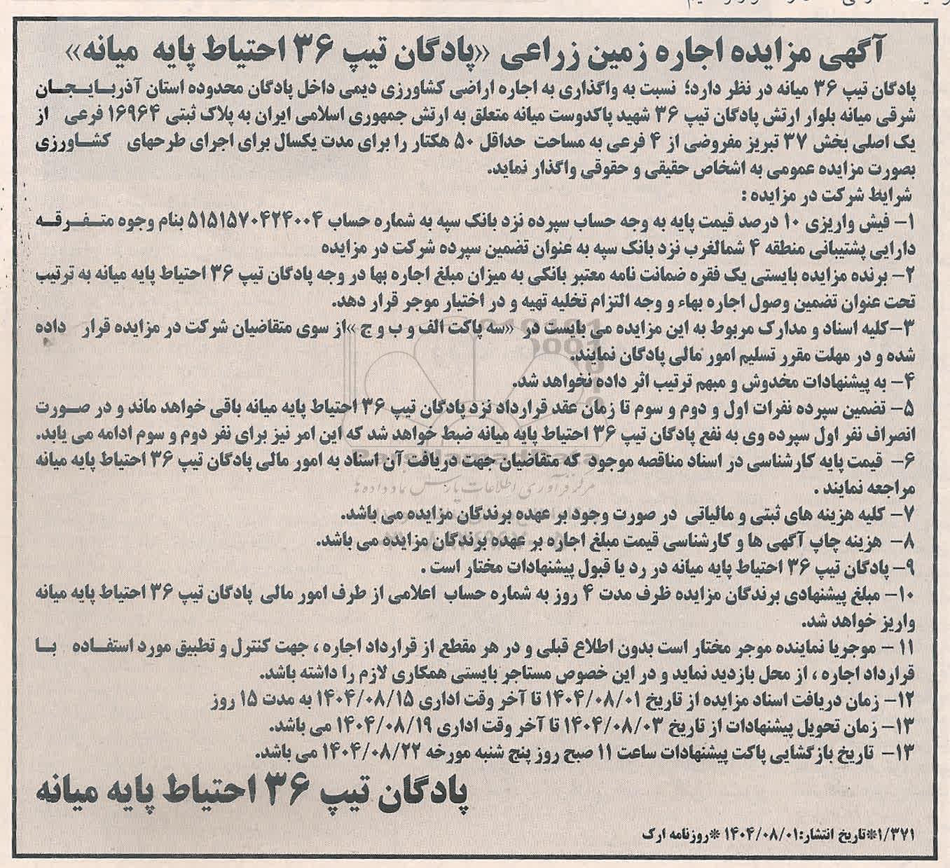 آگهی مزایده اجاره زمین زراعی پادگان تیپ 36 احتیاط پایه میانه