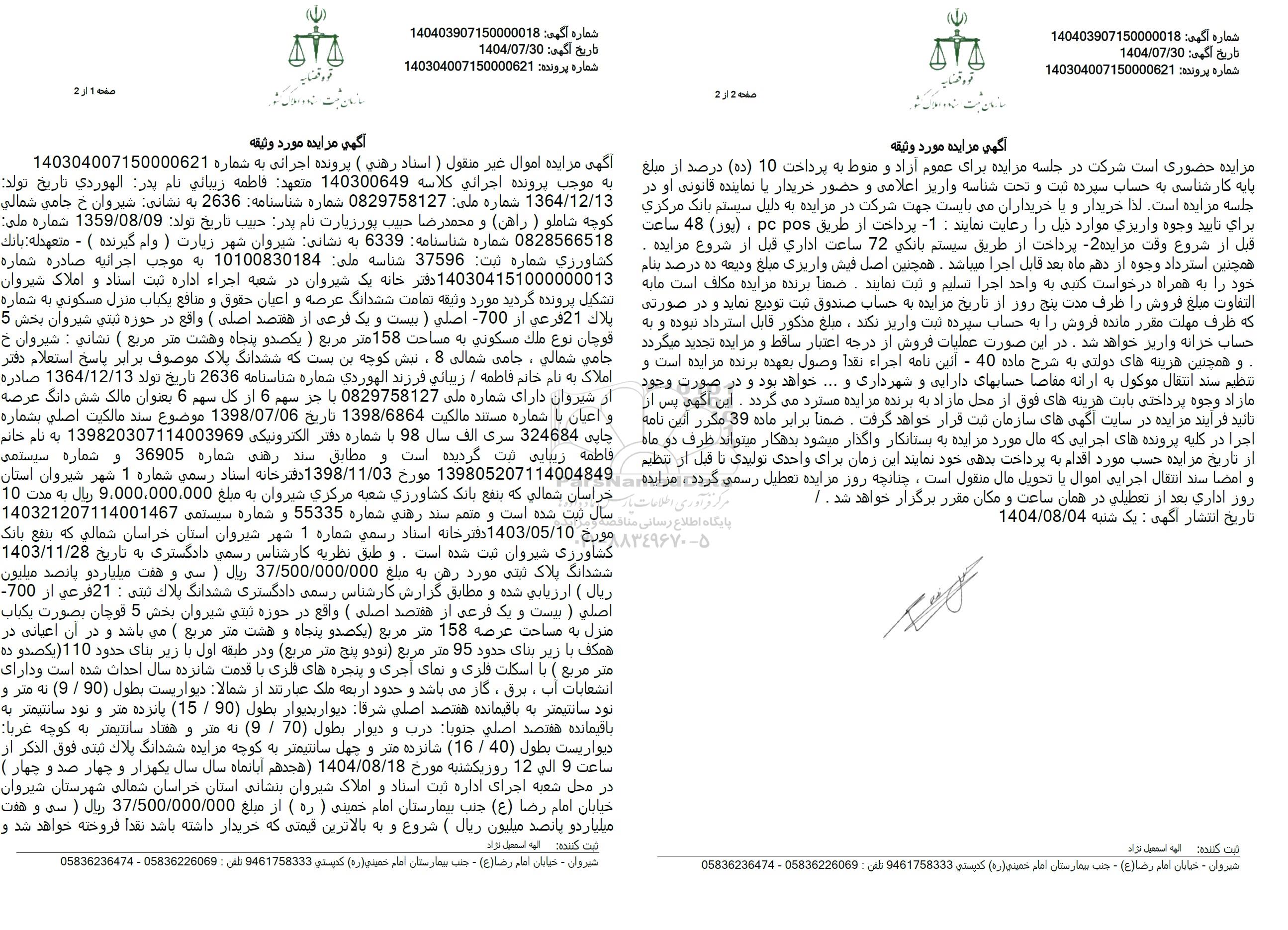 آگهی مزایده اموال غیر منقول ( استاد رهنی ) پرونده اجرائی به شماره 140304007150000621 به موجب پرونده اجرائی کلاسه 140300649 متعهد فاطمه زیبائی نام پدر الهوردی تاریخ تولد: 1364.12.13 شماره ملی 0829758127 شماره شناسنامه 2636 به نشانی شیروان خ جامی شمالی کوچه شاملو ( راهن) و محمدرضا حبیب پور زیارت نام پدر حبیب تاریخ تولد: 1359.08.09 شماره ملی: 0828566518 شماره شناسنامه 6339 به نشانی شیروان شهر زیارت ( وام گیرنده ) - متعهدله بانک کشاورزی شماره ثبت 37596 شناسه ملی 10100830184 به موجب اجرائیه صادره شماره 140304151000000013 دفتر خانه یک شیروان در شعبه اجراء اداره ثبت اسناد و املاک شیروان تشکیل پرونده گردید مورد وثیقه تمامت ششدانگ عرصه و اعیان حقوق و منافع یکباب منزل مسکونی به شماره بلاک 21 فرعی از 700 اصلی ) بیست و یک فرعی از هفتصد اصلی ( واقع در حوزه تبنی شیروان بخش 5 فوجان نوع ملک مسکونی به مساحت 158 متر مربع ( یکصدو پنجاه و هشت متر مربع ) نشانی : شیروان خ جامی شمالی ، جامی شمالی 8 نبش کوچه بن بست که ششدانگ پلاک موصوف برابر پاسخ استعلام دفتر املاک به نام خانم فاطمه . ریبانی فرزند الهوردی شماره شناسنامه 2636 تاریخ تولد 1364.12.13 صادره از شیروان دارای شماره ملی 0829758127 با جز سهم 6 از کل سهم 6 بعنوان مالک شش دانگ عرصه و اعیان با شماره مستند مالکیت 1398.6864 تاریخ 1398.07.06 موضوع سند مالکیت اصلی بشماره چاپی 324684 سری الف سال 98 با شماره دفتر الکترونیکی 139820307114003969 به نام خانم فاطمه زیبایی ثبت گردیده است و مطابق سند رهنی شماره 36905 و شماره سیستمی 139805207114004849 مورخ 1398.11.03 دفترخانه اسناد رسمی شماره 1 شهر شیروان استان خراسان شمالی که بنفع بانک کشاورزی شعبه مرکزی شیروان به مبلغ 9,000,000,000 ریال به مدت 10 سال ثبت شده است و متمم سند رهنی شماره 55335 و شماره سیستمی 140321207114001467 مورخ 1403.05.10 دفترخانه اسناد رسمی شماره 1 شهر شیروان استان خراسان شمالی که بنفع بانک کشاورزی شیروان ثبت شده است. و طبق نظریه کارشناس رسمی دادگستری به تاریخ 1403.11.28 ششدانگ پلاک ثبتی مورد رهن به مبلغ 37.500.000.000 ریال ) سی و هفت میلیارد و پانصد میلیون ریال ) ارزیابی شده و مطابق گزارش کارشناس رسمی دادگستری ششدانگ پلاک ثبتی : 21 فرعی از 700 اصلی ( بیست و یک فرعی از هفتصد اصلی ( واقع در حوزه ثبتی شیروان بخش 5 قوچان بصورت یکباب منزل به مساحت عرصه 158 متر مربع (یکصد و پنجاه و هشت متر مربع ) میباشد و در آن اعیانی در همکف با زیر بنای حدود 95 متر مربع نودو پنج متر مربع و در طبقه اول با زیر بنای حدود 110 یکصدو ده متر مربع ) با اسکلت فلزی و نمای آجری و پنجره های فلزی با قدمت شانزده سال احداث شده است و دارای انشعابات آب ، برق ، گاز میباشد و حدود اربعه ملک عبارتند از شمالا دیواریست بطول (90 . 9) نه متر و نود سانتیمتر به باقیمانده هفتصد اصلی شرقا دیوار بدیوار بطول (90) . (15) پانزده متر و نود سانتیمتر به باقیمانده هفتصد اصلی جنوبا درب و دیوار بطول (70) . (9) نه متر و هفتاد سانتیمتر به کوچه غربا دیواریست بطول 40 . 16 شانزده متر و چهل سانتیمتر به کوچه مزایده ششدانگ پلاک ثبتی فوق الذکر از ساعت 9 الی 12 روز یکشنبه مورخ 1404.08.18 هجدهم آبانماه سال سال یکهزار و چهار صد و چهار ) در محل شعبه اجرای اداره ثبت اسناد و املاک شیروان بنشانی استان خراسان شمالی شهرستان شیروان خیابان امام رضا (ع) جنب بیمارستان امام خمینی ( ره ) از مبلغ 37.500.000.000 ریال ( سی و هفت میلیارد و پانصد میلیون ریال ) شروع و به بالاترین قیمتی که خریدار داشته باشد نقدا فروخته خواهد شد و مزایده حضوری است شرکت در جلسه مزایده برای عموم آزاد و منوط به پرداخت 10 (ده) درصد از مبلغ پایه کارشناسی به حساب سپرده ثبت و تحت شناسه واریز اعلامی و حضور خریدار با نماینده قانونی او در جلسه مزایده است. لذا خریدار و با خریداران می بایست جهت شرکت در مزایده به دلیل سیستم بانک مرکزی برای تایید وجوه واریزی موارد ذیل را رعایت نمایند : -1 پرداخت از طریق pc pos (پور) 48 ساعت قبل از شروع وقت مزایده -2 پرداخت از طریق سیستم بانکی 72 ساعت اداری قبل از شروع مزایده همچنین استرداد وجو