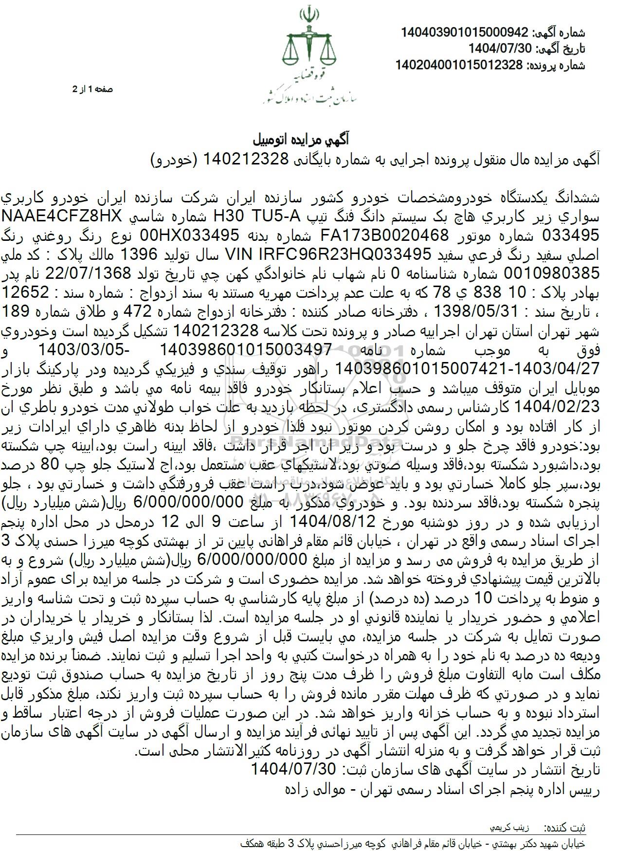 آگهی مزایده مال منقول پرونده اجرایی به شماره بایگانی 140212328 (خودرو)