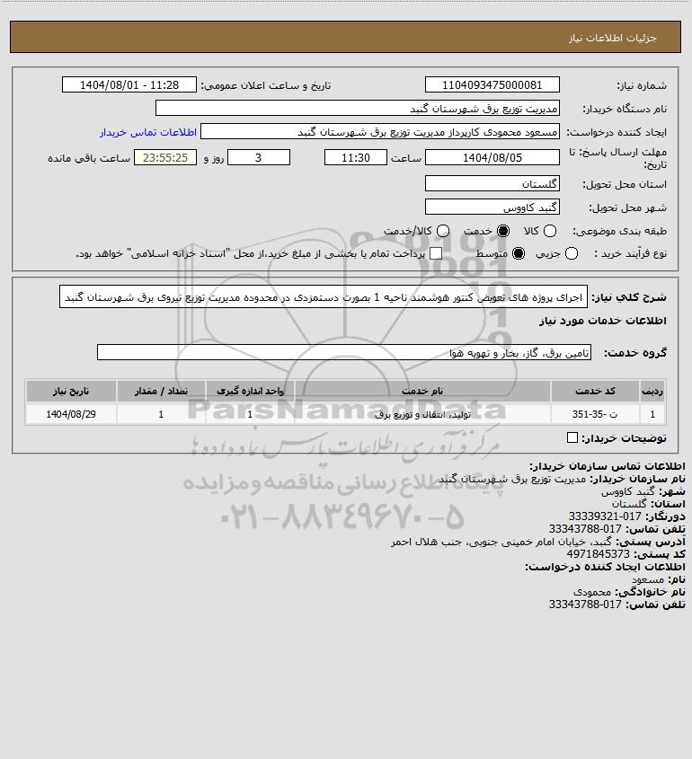 شرح کلی نیاز: اجرای پروژه های تعویض کنتور هوشمند ناحیه 1 بصورت دستمزدی در محدوده مدیریت توزیع نیروی برق شهرستان گنبد