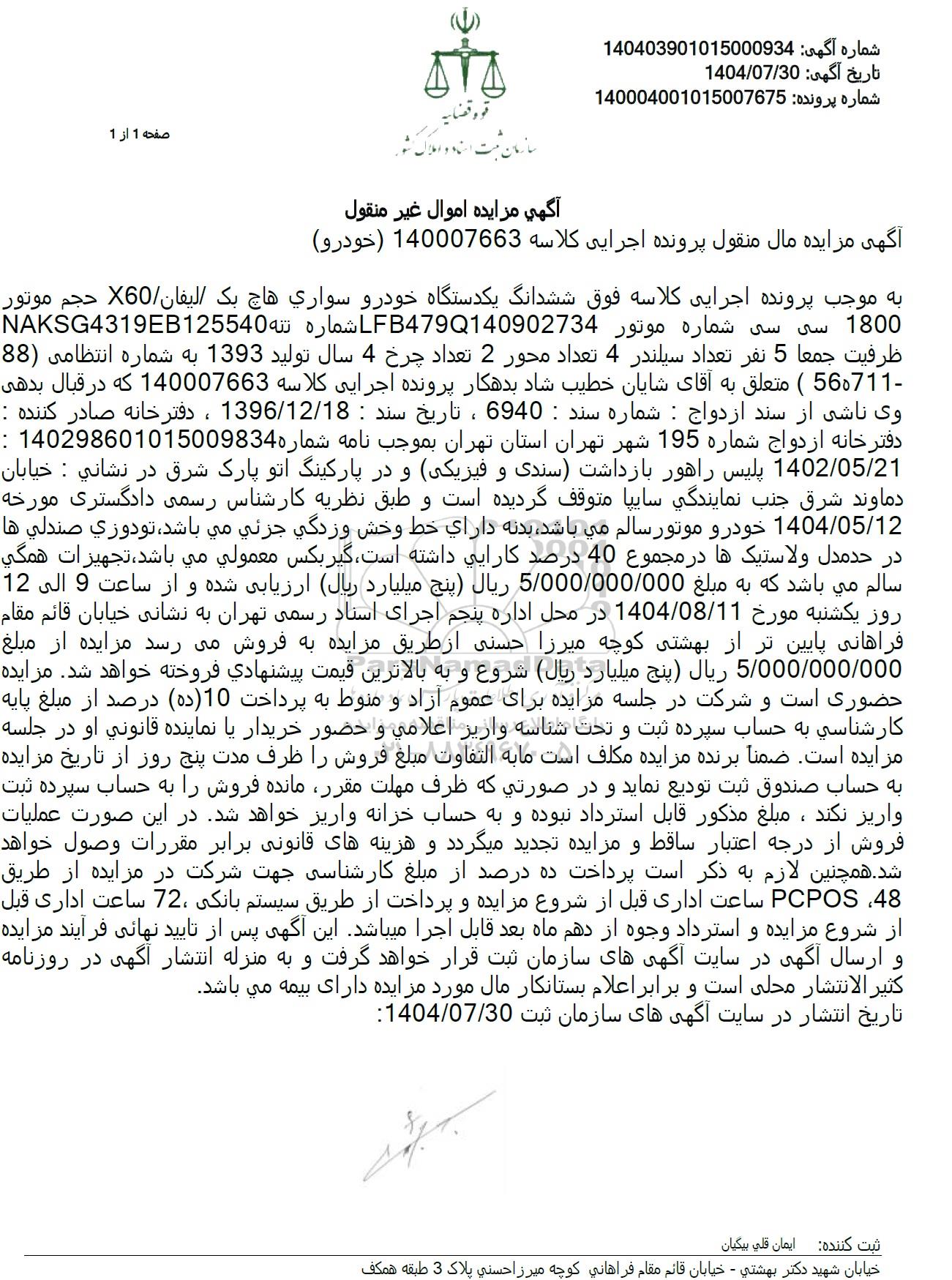 به موجب پرونده اجرایی کلاسه فوق ششدانگ یکدستگاه خودرو سواري هاچ بک لیفان X60 حجم موتور NAKSG4319EB125540 شماره ته LFB479Q140902734 1800 سی سی شماره موتور ظرفیت جمعا 5 نفر تعداد سیلندر 4 تعداد محور 2 تعداد چرخ 4 سال تولید 1393 به شماره انتظامی (88) -560711 ) متعلق به آقای شایان خطیب شاد بدهکار پرونده اجرایی کلاسه 140007663 که در قبال بدهی وی ناشی از سند ازدواج : شماره سند : 6940 ، تاریخ سند : 1396.12.18 ، دفترخانه صادر کننده : دفترخانه ازدواج شماره 195 شهر تهران استان تهران بموجب نامه شماره 140298601015009834 : 1402.05.21 پلیس راهور بازداشت سندی و فیزیکی و در پارکینگ اتو پارک شرق در نشانی : خیابان دماوند شرق جذب نمایندگی سایپا متوقف گردیده است و طبق نظریه کارشناس رسمی دادگستری مورخه 1404.05.12 خودرو موتور سالم می باشد، بدنه دارای خط وخش وزدگي جزئي مي باشد، تودوزی صندلی ها در حدمدل ولاستیک ها در مجموع 40 درصد کارایی داشته است، گیربکس معمولی می باشد، تجهیزات همگي سالم می باشد که به مبلغ 5.000.000.000 ریال پنج میلیارد ریال ارزیابی شده و از ساعت 9 الی 12 روز یکشنبه مورخ 1404.08.11 در محل اداره پنجم اجرای اسناد رسمی تهران به نشانی خیابان قائم مقام فراهانی پایین تر از بهشتی کوچه میرزا حسنی از طریق مزایده به فروش میرسد مزایده از مبلغ 5.000.000ر000 ریال پنج میلیارد ریال شروع و به بالاترین قیمت پیشنهادی فروخته خواهد شد. مزایده حضوری است و شرکت در جلسه مزایده برای عموم آزاد و منوط به پرداخت (10 ده درصد از مبلغ پایه کارشناسی به حساب سپرده ثبت و تحت شناسه واریز اعلامی و حضور خریدار یا نماینده قانونی او در جلسه مزایده است. ضمنا برنده مزایده مکلف است ما به التفاوت مبلغ فروش را ظرف مدت پنج روز از تاریخ مزایده به حساب صندوق ثبت تودیع نماید و در صورتی که ظرف مهلت مقرر مانده فروش را به حساب سپرده ثبت واریز نکند، مبلغ مذکور قابل استرداد نبوده و به حساب خزانه واریز خواهد شد. در این صورت عملیات فروش از درجه اعتبار ساقط و مزایده تجدید میگردد و هزینه های قانونی برابر مقررات وصول خواهد شد. همچنین لازم به ذکر است پرداخت ده درصد از مبلغ کارشناسی جهت شرکت در مزایده از طریق 48 PCPOS ساعت اداری قبل از شروع مزایده و پرداخت از طریق سیستم بانکی 72 ساعت اداری قبل از شروع مزایده و استرداد وجوه از دهم ماه بعد قابل اجرا میباشد. این آگهی پس از تایید نهایی فرآیند مزایده و ارسال آگهی در سایت آگهی های سازمان ثبت قرار خواهد گرفت و به منزله انتشار آگهی در روزنامه كثير الانتشار محلی است و برابر اعلام بستانکار مال مورد مزایده دارای بیمه می باشد.