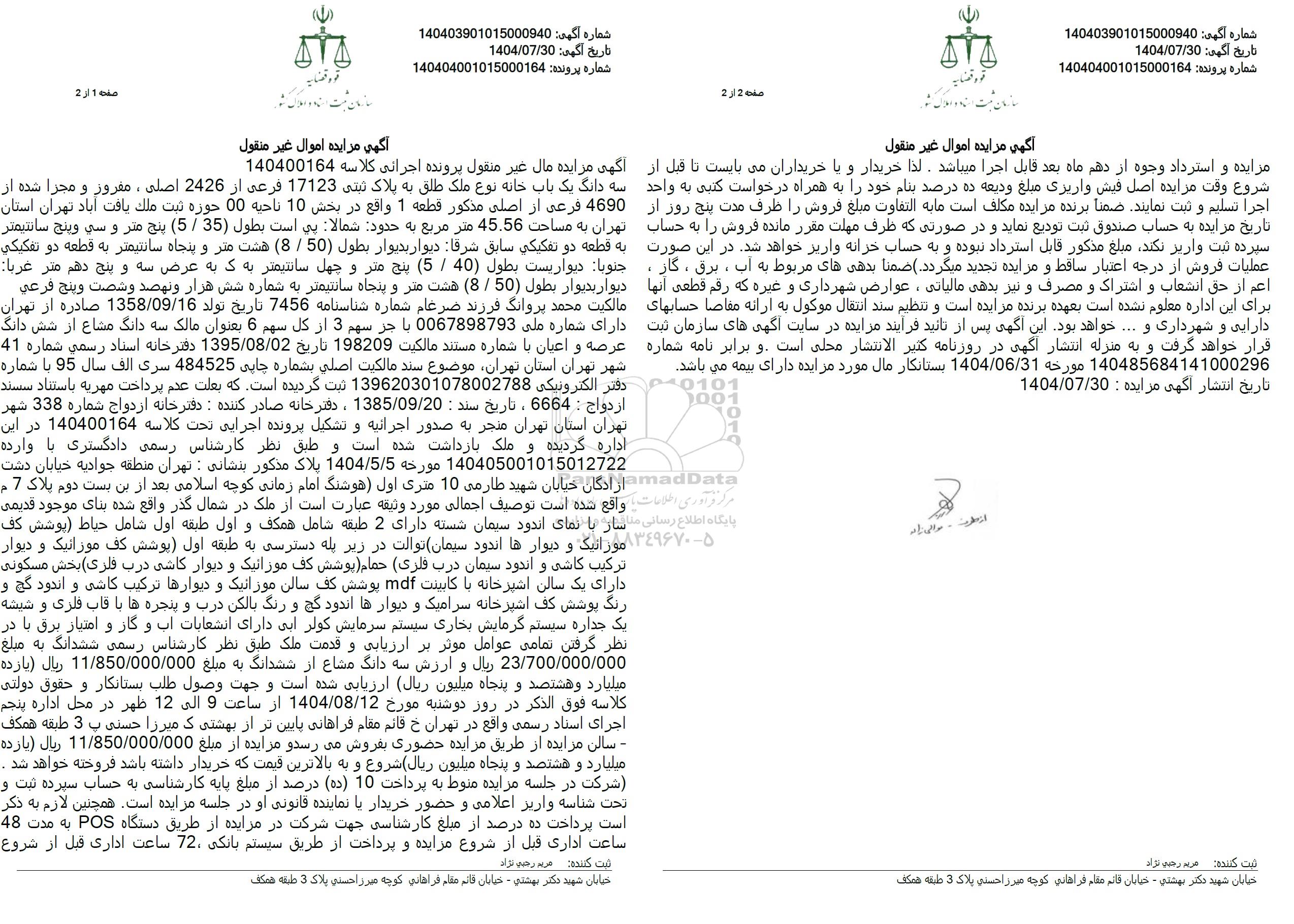 آگهی مزایده مال غیر منقول پرونده اجرائی کلاسه 140400164