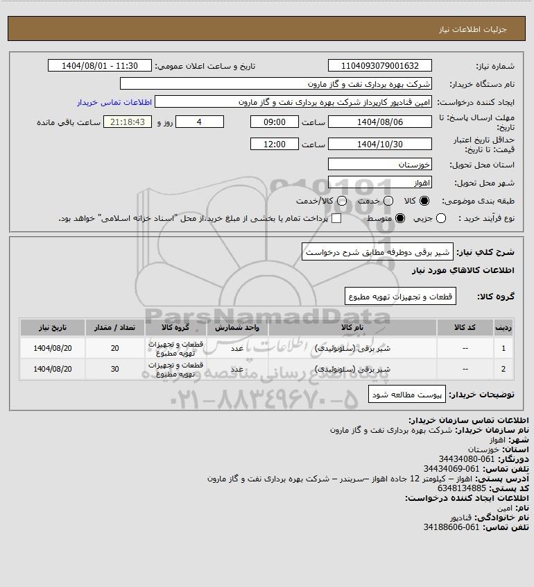 | 2 | -- | شیر برقی (سلونوئیدی) | عدد | قطعات و تجهیزات تهویه مطبوع | 30 | 1404/08/20 |