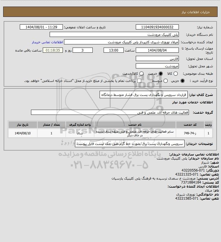 شرح کلی نیاز: قرارداد سرویس و نگهداری پست برق فشار متوسط درمانگاه
