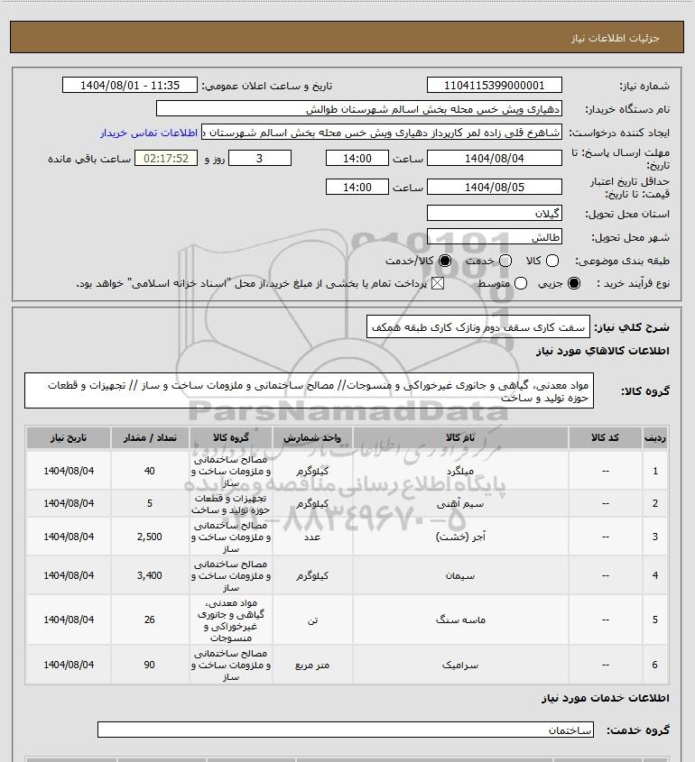| 3 | -- | آجر (خشت) | عدد | مصالح ساختمانی و ملزومات ساخت و ساز | 2,500 | 1404/08/04 |