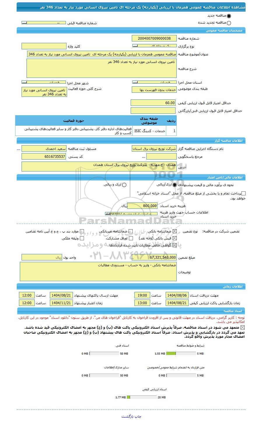 | شرح مناقصه | تامین نیروی انسانی مورد نیاز به تعداد 346 نفر | ||||||||