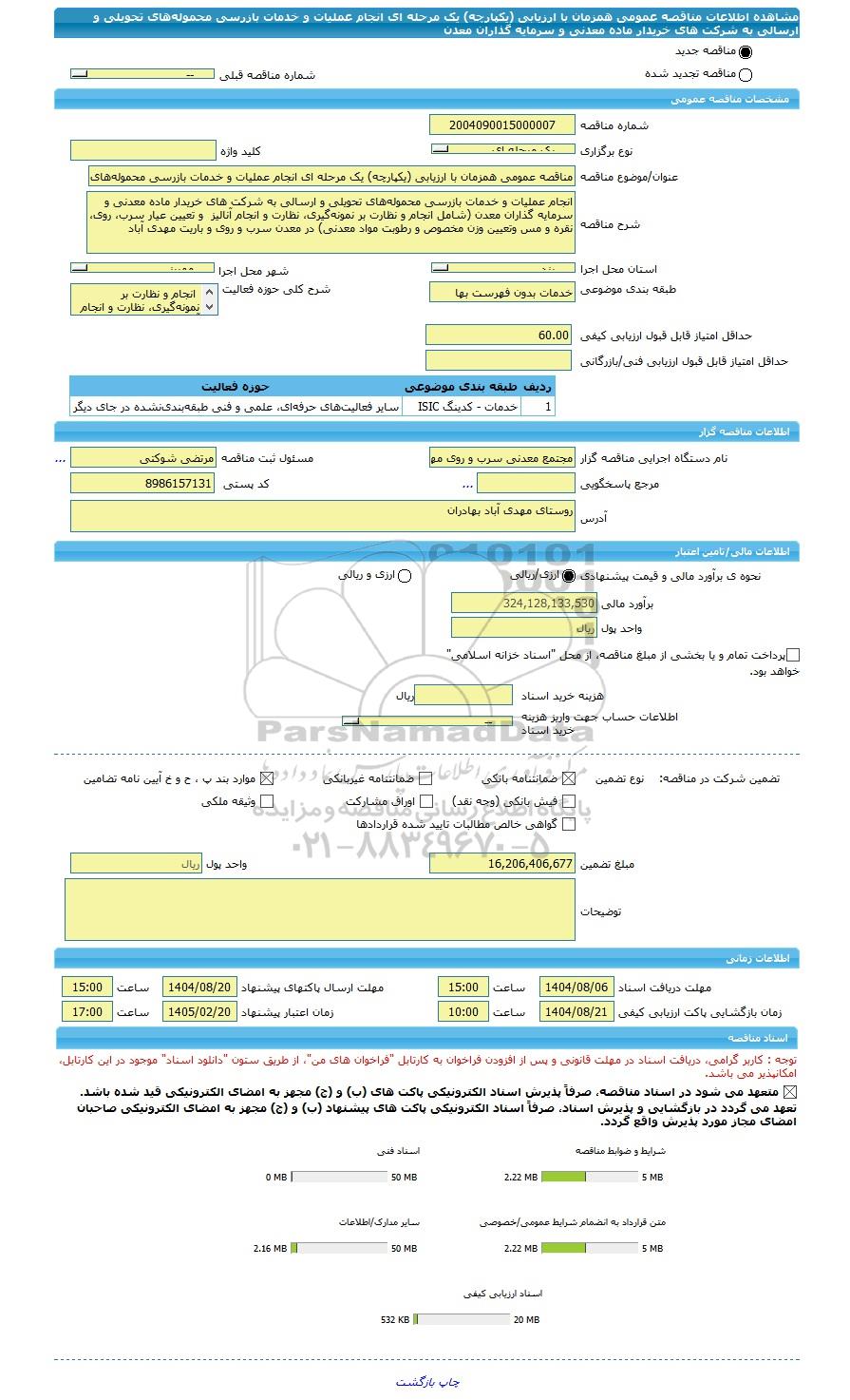 عنوان/موضوع مناقصهمناقصه عمومی همزمان با ارزیابی (یکپارچه) یک مرحله ای انجام عملیات و خدمات بازرسی محموله های تحویلی و ارسالی به شرکت های خریدار ماده معدنی و سرمایه گذاران معدن