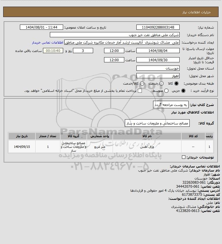 1 -- ورق آهنی متر مربع مصالح ساختمانی و ملزومات ساخت و ساز 1 1404/09/15