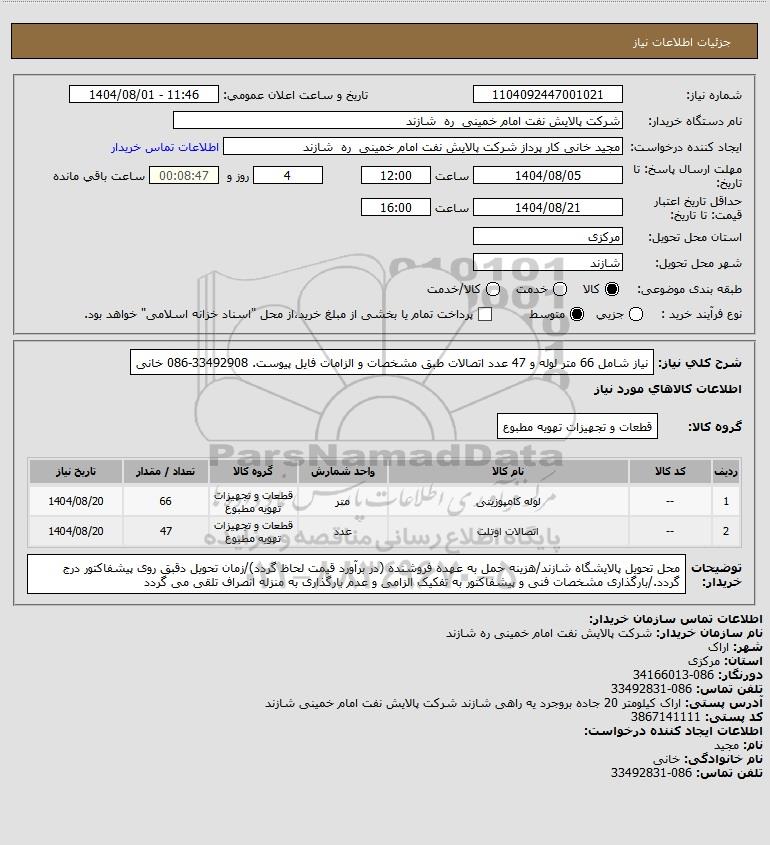 شرح کلی نیاز: نیاز شامل 66 متر لوله و 47 عدد اتصالات طبق مشخصات و الزامات فایل پیوست. 33492908-086 خانی