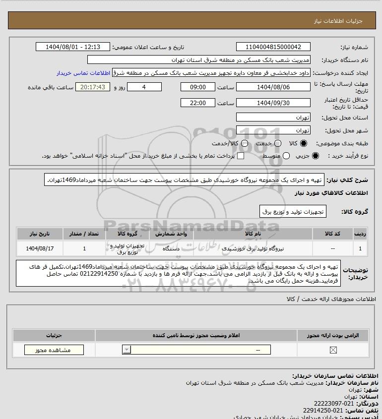 شرح کلی نیاز: تهیه و اجرای یک مجموعه نیروگاه خورشیدی طبق مشخصات پیوست جهت ساختمان شعبه میرداماد1469تهران.