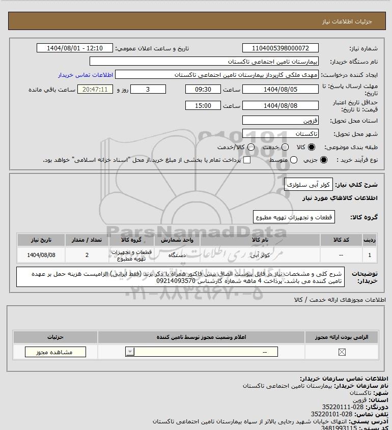 | 1 | -- | کولر آبی | دستگاه | قطعات و تجهیزات تهویه مطبوع | 2 | 1404/08/08 |