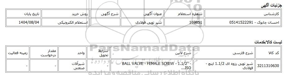 احسان چابوک - 05141522291169851شیر توپی فولادیاستعلام الکترونیکی1404/08/04