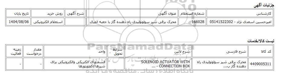 | امیرحسین اسعدی نژاد - 05141522302 | 166028 | محرک برقی شیر سولونوئیدی راه دهنده گاز با جعبه اتصال | استعلام الکترونیکی | 1404/08/06 |