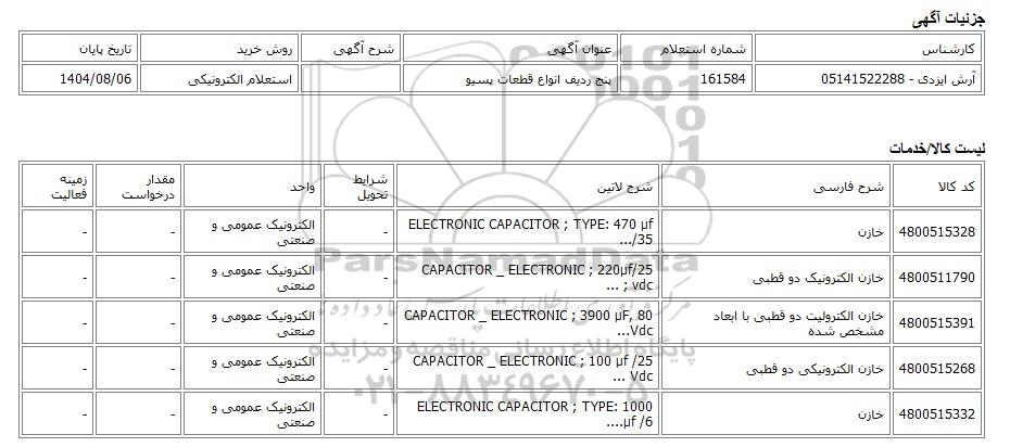 | آرش ایزدی - 05141522288 | 161584 | پنج ردیف انواع قطعات پسیو | استعلام الکترونیکی | 1404/08/06 |