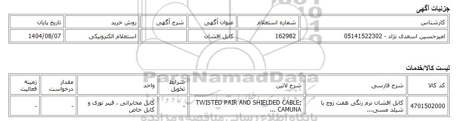 | امیرحسین اسعدی نژاد - 05141522302 | 162982 | کابل افشان | استعلام الکترونیکی | 1404/08/07 |