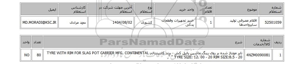 | 1 | 4NZM0090081 | تایر مونتاژ شده بر روی رینگ ماشین پاتیل کش - برند کانتیننتال, TYRE WITH RIM FOR SLAG POT CARRIER MFG. CONTINENTAL " TYRE SIZE: 12. 00 - 20 RIM SIZE:8.5 - 20 ", | 80 | NO |