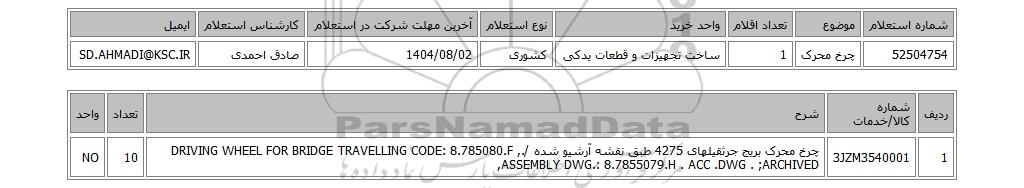| 52504754 | چرخ محرک | 1 | ساخت تجهیزات و قطعات یدکی | کشوری | 1404/08/02 | صادق احمدی | SD.AHMADI@KSC.IR |