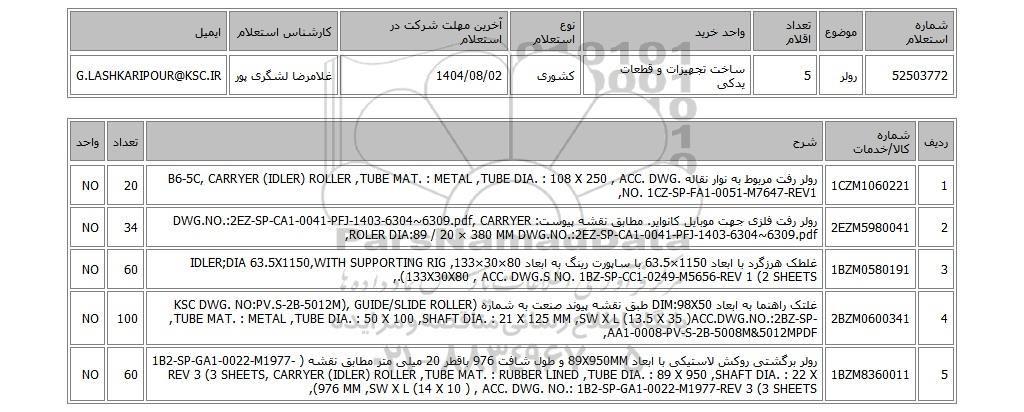 | 52503772 | رولر | 5 | ساخت تجهیزات و قطعات یدکی | کشوری | 1404/08/02 | غلامرضا لشگری پور | G.LASHKARIPOUR@KSC.IR |