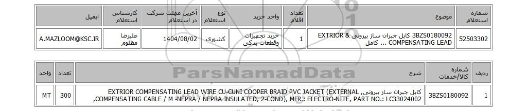 | 52503302 | 3BZS0180092 کابل جبران ساز بیرونی & EXTRIOR COMPENSATING LEAD ... کامل | 1 | خرید تجهیزات وقطعات یدکی | کشوری | 1404/08/02 | علیرضا مظلوم | A.MAZLOOM@KSC.IR |
