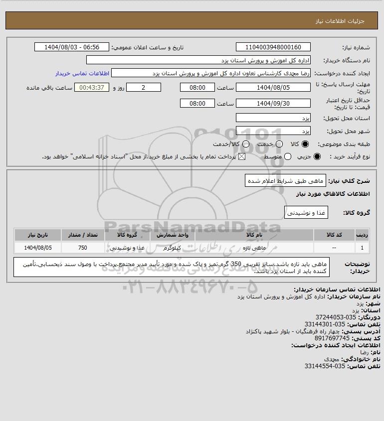 شرح کلی نیاز: ماهی طبق شرایط اعلام شده