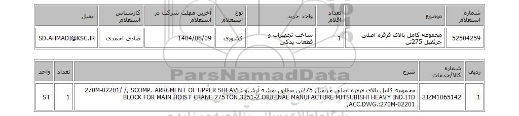 | 52504259 | مجموعه کامل بالای قرقره اصلی جرثقیل 275تن | 1 | ساخت تجهیزات و قطعات یدکی | کشوری | 1404/08/09 | صادق احمدی | SD.AHMADI@KSC.IR |