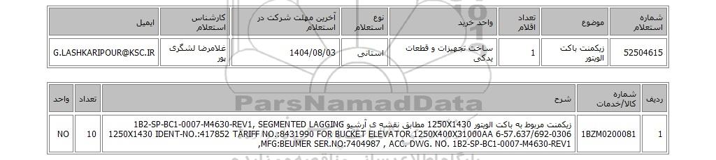 | 52504615 | زیکمنت باکت الویتور | 1 | ساخت تجهیزات و قطعات یدکی | استانی | 1404/08/03 | غلامرضا لشگری پور | G.LASHKARIPOUR@KSC.IR |