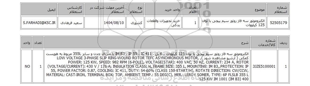 | 52505179 | الکتروموتور سه فاز روتور سیم پیچی با توان 125 کیلووات | 1 | خرید تجهیزات وقطعات یدکی | کشوری | 1404/08/10 | سعید فرهادی | S.FARHADI@KSC.IR |