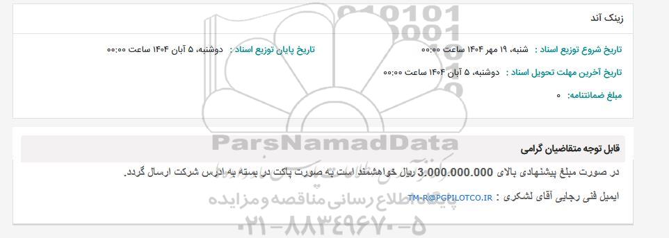 نحوه دریافت اسناد و ارسال پیشنهاد: متقاضیان میتوانند با ثبت نام در سامانه مناقصات و مزایدات ایران (پارس نماد) نسبت به مشاهده اسناد استعلام، دریافت اطلاعات تکمیلی، و ثبت پیشنهاد قیمت خود اقدام نمایند. در صورت نیاز به دریافت راهنمایی یا پشتیبانی در خصوص استعلام و مناقصه و فراخوان مناقصه عمومی، مناقصه محدود، مناقصه بین المللی، مناقصه دولتی، مناقصه خصوصی، مناقصه آنلاین فروش تجهیزات، مناقصه مشاورهای مناقصه پتروشیمی و انرژی مناقصه صنایع و تجهیزات برق و مخابرات و نفت و گاز ... لطفاً با سایت خبری مناقصه و مزایده پارسنماد دادهها به شماره 88349670 تماس حاصل فرمایید.