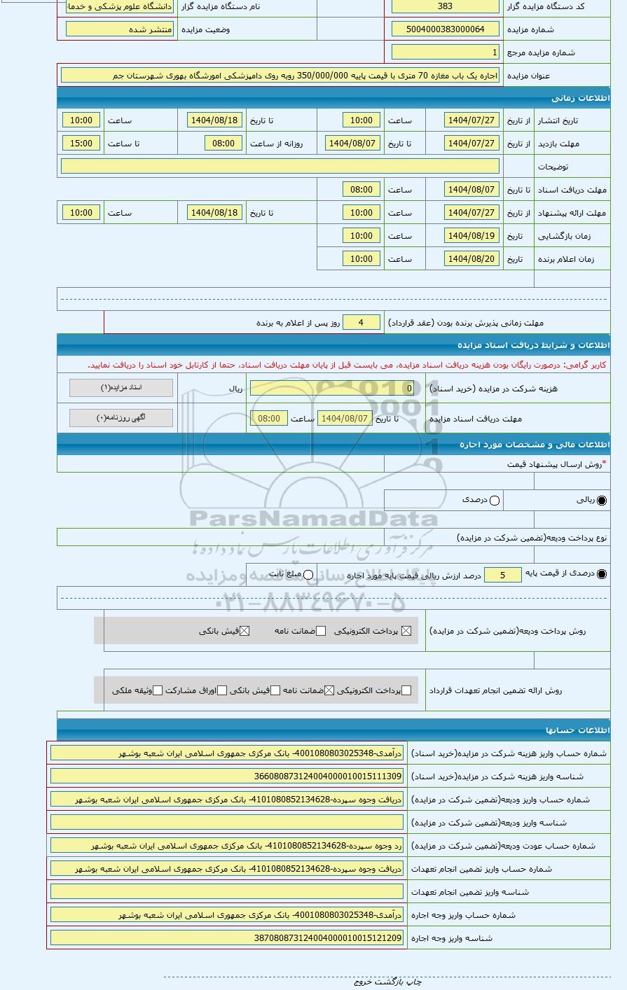 | شماره مورد اجاره | 5104000383000062 | نوع برگزاری مزایده | مزایده عمومی | |