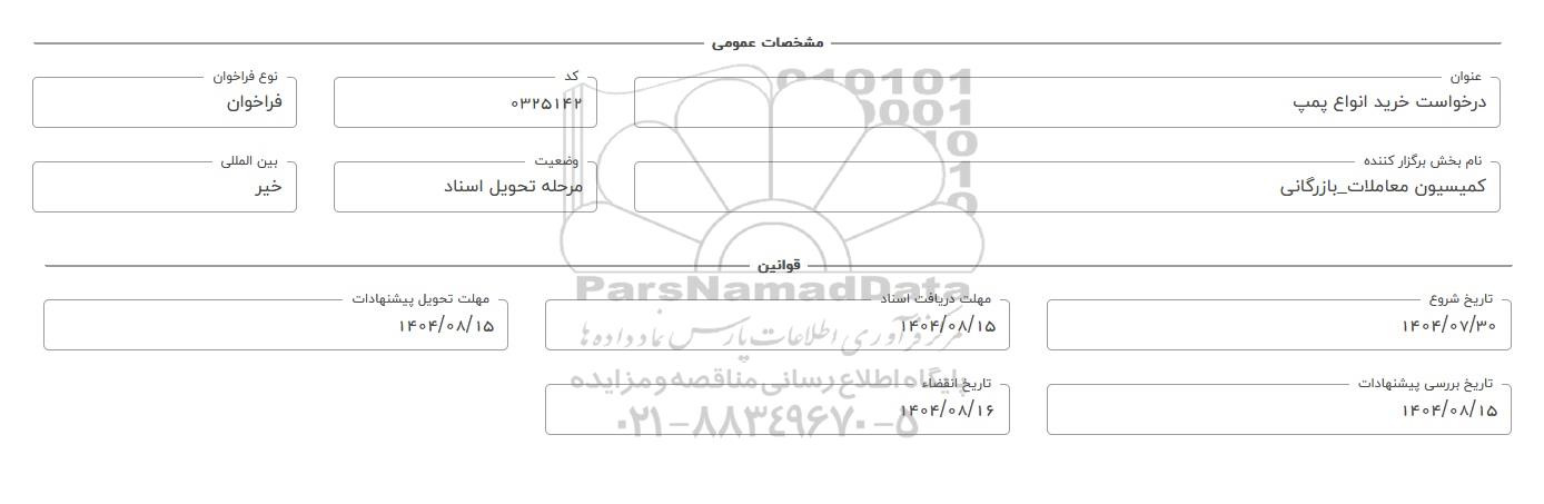 فراخوان، استعلام خرید انواع پمپ از کلیه افراد متخصص و شرکتها واجد شرایط دعوت به عمل میآید در مناقصه با کد خبرگزاری پارس نماد: 9743601 شرکت نمایند.
