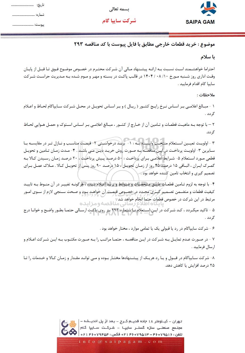 موضوع : خرید قطعات خارجی مطابق با فایل پیوست با کد مناقصه 293