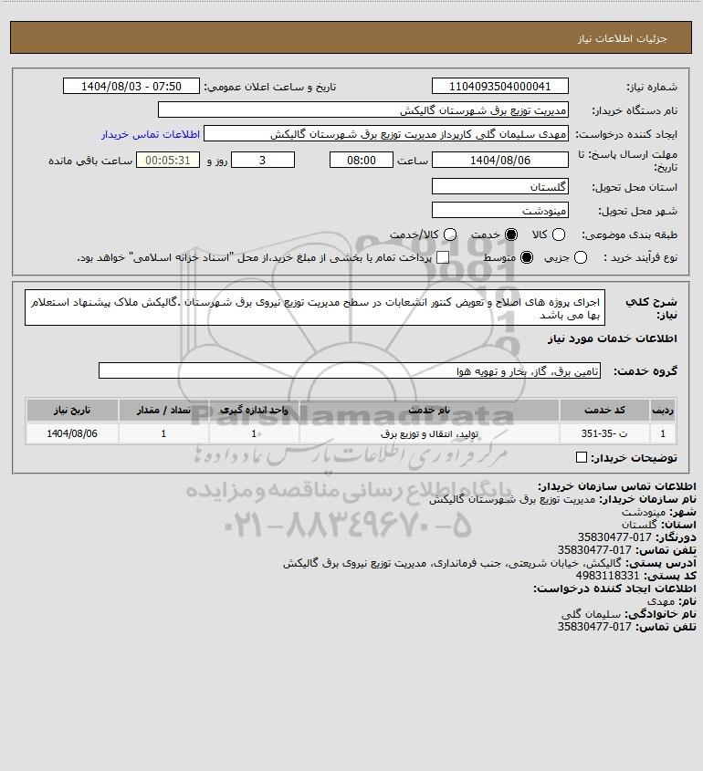 شرح کلی نیاز: اجرای پروژه های اصلاح و تعویض کنتور انشعابات در سطح مدیریت توزیع نیروی برق شهرستان .گالیکش