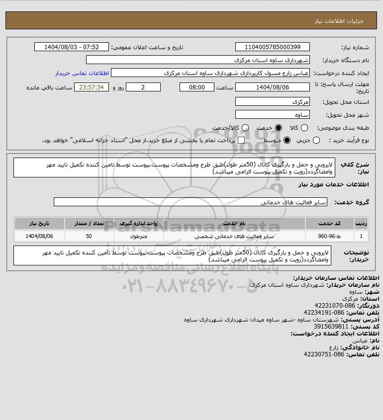 شرح کلی نیاز: لایروبی و حمل و بارگیری کانال (50متر طول)طبق طرح ومشخصات پیوست،پیوست توسط تامین کننده تکمیل تایید مهر وامضاگردد(رویت و تکمیل پیوست الزامی میباشد)