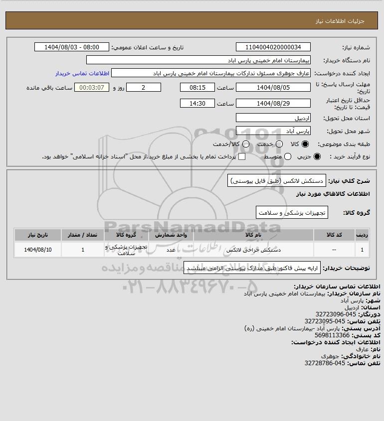 استعلام بها و موضوع استعلام استعلام دستکش لاتکس (طبق فایل پیوستی) به اطلاع کلیه شرکتها و افراد متخصص واجد شرایط میرساند، آگهی گذار در نظر دارد از طریق استعلام بها، نسبت به انتخاب و دریافت پیشنهادات اقدام نماید. این استعلام با کد آگهی ثبت شده در سامانه خبرگزاری پارس نماد : 9743941 منتشر شده است. مشخصات استعلام : تاریخ شروع استعلام: 1404/08/03 آخرین مهلت ارسال پیشنهاد قیمت : 1404/08/05 و محل اجرای پروژه : استان اردبیل میباشد. استعلام قیمت مورد درخواست : استعلام دستکش لاتکس (طبق فایل پیوستی) با دستهبندیهای تخصصی و گروه های مرتبط : خدمات و تجهیزات آزمایشگاهی و پزشکی, استعلام اطلاع رسانی میگردد.